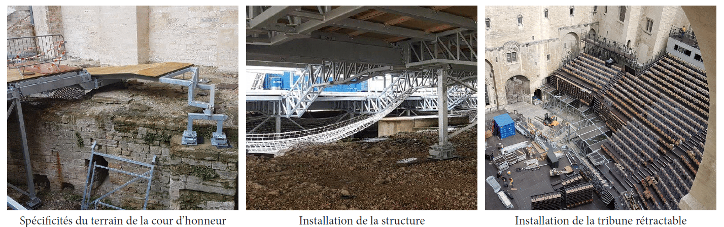 « Le cahier des charges de cette nouvelle tribune rétractable imposait un certain nombre de contraintes techniques et réglementaires avec notamment l’objectif d’une facilité de montage et démontage. Le volume du projet, les demandes d’adaptations scéniques multiples, la mise en place de 31 modules télescopes sur l’ossature métallique de 3 niveaux ont demandé une certaine prise de recul pour ajuster les hypothèses de calculs ».