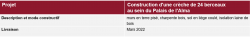 Le projet de construction de la crèche et de l’accueil enfants se compose de murs en terre crue, d’une ossature bois supportant une toiture végétalisée. Les façades Nord et Sud intègrent de nombreuses menuiseries.