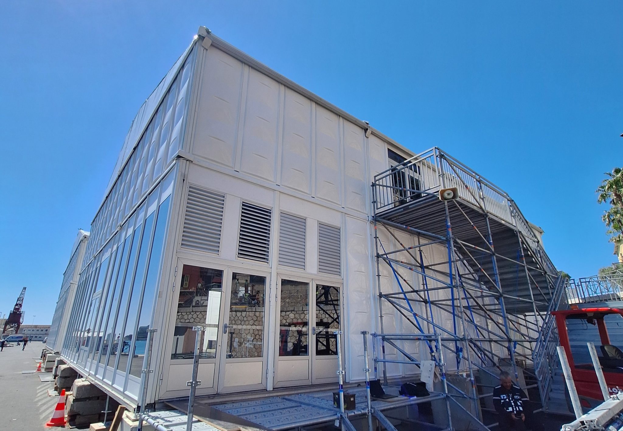 Deux sites majeurs ont accueilli des structures temporaires complexes : le Port de Nice et le Palais des Congrès, avec notamment deux CTS à étage de grandes dimensions (20×30 m et 32×50 m). Il s’agissait de la première mission de ce type après l’obtention de l’habilitation, mobilisant les compétences de Robin Chanal, Responsable Local Structure et Événementiel.