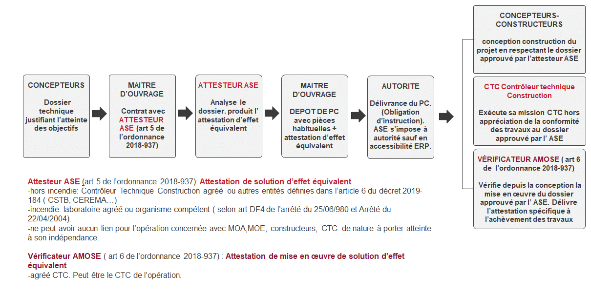 Dès la phase conception, le maître d’ouvrage doit faire constituer par les concepteurs un dossier décrivant la solution innovante et justifiant son équivalence aux règles actuelles, il doit faire valider cette solution par un organisme désigné et obtenir une Attestation de Solution d’effet Equivalent (mission ASE). Un contrôleur technique qui n’a pas d’autre mission sur l’opération concernée peut prendre en charge cette attestation.