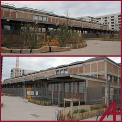 La transformation de 15 travées de l’ancienne halle en un groupe scolaire impliquait la préservation de l’architecture existante, la réutilisation de certains espaces, l’utilisation de matériaux écologiques tels que la terre cuite de récupération et le bois, ainsi que la végétalisation des espaces.