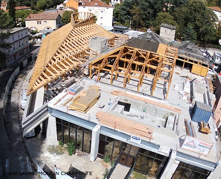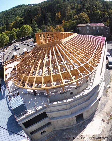 Un travail important a été mené sur la conception globale du système bassin béton-structure bois pour répondre aux critères de résistance de matériaux et de déformation (mise en place de connecteurs, prise en compte des taux d’hygrométrie, etc.).
