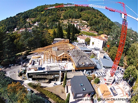Le projet prévoit l’extension du bâtiment avec la création notable de l’«espace goutte» qui comprendra en particulier un bassin de bien-être au R+1. L’objet est de créer un bassin bien-être en béton qui repose sur une structure porteuse en bois. Une charpente monumentale bois prend place au-dessus de celui-ci.