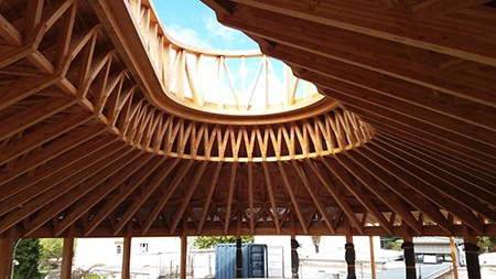 Une majestueuse charpente bois en forme de goutte comprenant une ferme monumentale, support d’une couverture centrale partielle en ETFE (Coussins gonflables), prend place au-dessus du bassin de bien-être.