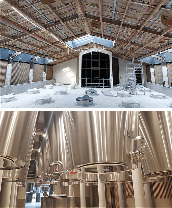 – Cuves de vinification : afin de rentrer deux fois plus de cuves dans la même boîte tout en libérant de l’espcae pour accueillir le public et les invités privilégiés, il a été choisi de suspendre les 46 cuves en inox, telles des ogives rivées au toit. Le poids de ces cuves, a nécessité une infrastructure solide. Le plancher a été ferraillé avec des armatures en acier de gros diamètre, posées sur place avec quelques difficultés de mise en place compte tenu de l’encombrement. Une couronne métallique a été scellée dans le béton pour reprendre les charges. Deux cuviers ascenseurs permettent de remonter le jus de raisin en tête des cuves, et de remplir facilement les cuves depuis le plancher. Les opérations de vinification sont facilitées par cette suspente et le vin n’a plus qu’à être tiré depuis le RdC, optimisant ainsi l’ergonomie des opérations.